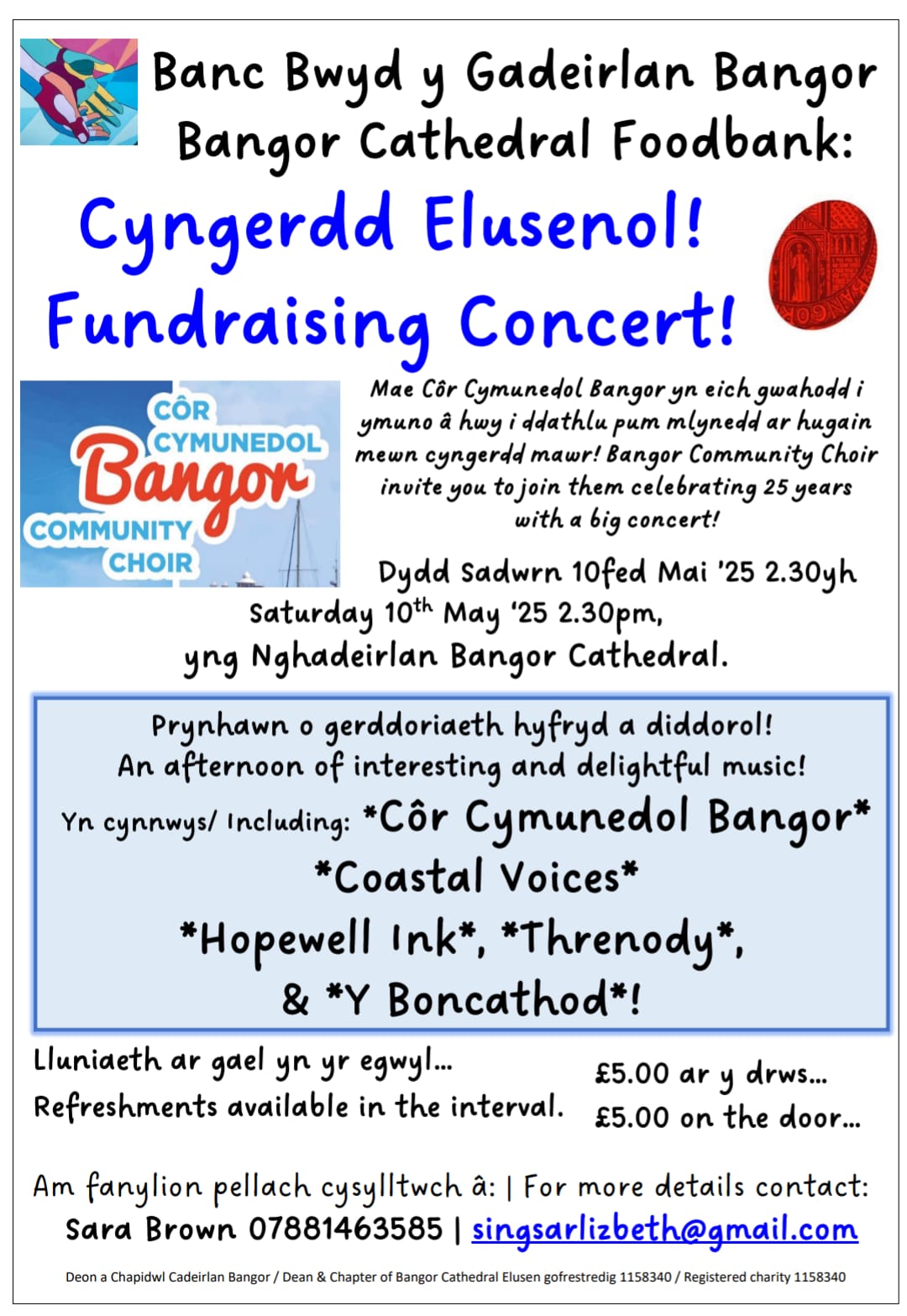 In May were were delighted to support Bangor Choir’s 25th Anniversary Food bank Fundraiser in Bangor Cathedral. Bangor Choir has fledged other singers, performers and choirs over the years, so it was a pleasure to join Y Boncathod, Threnody and Hopewell Ink! The afternoon concert was just lovely and raised £1130.00 for the Food bank. As always tea and cake just go hand in hand with singing :).
