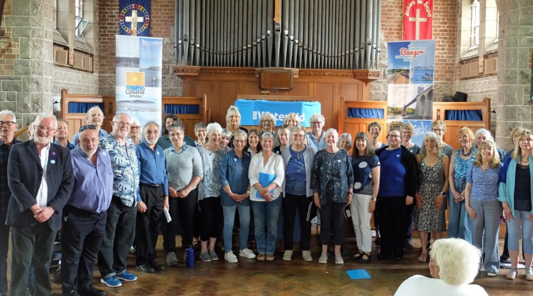 A chilly morning in February found is in St Tysilio’s Church, Church Island Menai Bridge. The church has no electricity and the candles in the candelabras had been lit… just magical. With our fellow singers from Bangor Choir we filled the tiny church with ourselves and our singing. Making our way up to St Mary’s church there was more singing before a celebratory lunch and magnificent views of the Menai Straits, from Dylan’s thanks to the team there who made up so welcome and enjoyed our singing!!